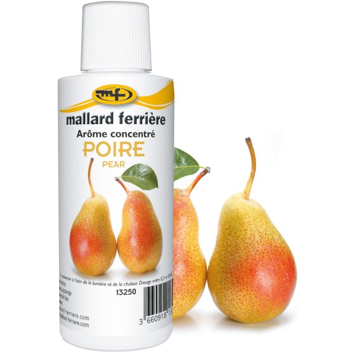 Retrouvez tout le goût de la poire dans cet arôme. La gamme Mallard Ferrière a spécialement été étudiée pour aromatiser les crèmes, entremets, bonbons, chocolats, ganaches, macarons, glaces, sorbets... tout en supportant les cuissons à haute température sans altération de l'arôme.