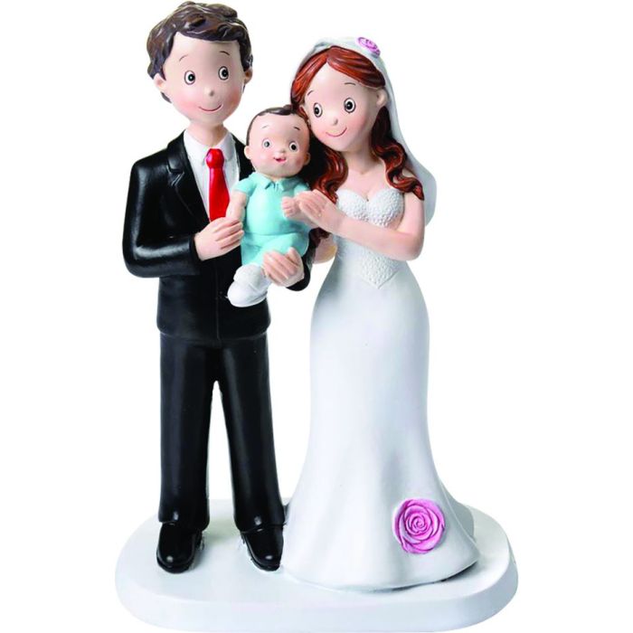 Parce que certains mariages sont aussi une célébration de la famille déjà formée, la figurine de mariage parents avec bébé bleu – 17 cm de Mallard Ferrière capture à merveille cette belle complicité.